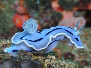 «Esto» que parece un «pokemon» es una babosa de mar, Es un molusco gasterópodo marino sin caracola, perteneciente a la familia Chromodorididae. Se caracteriza por su coloración azul vibrante con líneas negras, no puede ver por lo cual tiene tentaculos sensoriales